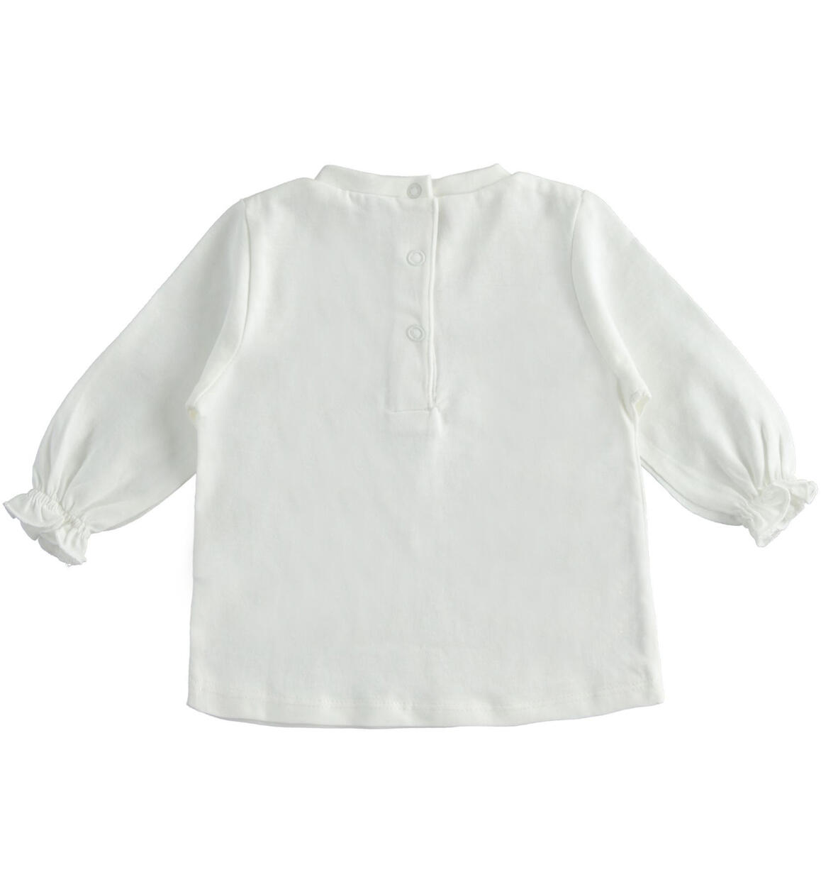 iDO baby girl t-shirt in 100% cotton jersey with glitter heart print and cuff with elastic and curl. Back opening with snap buttons