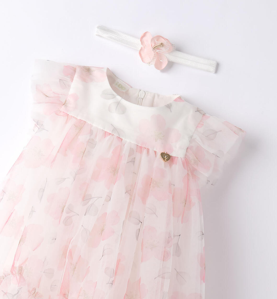 iDO baby girl formal dress in embroidered tulle with cotton lining. The model has a rear opening with an invisible zip to make it easier to put on. The dress has ruffles on the sleeves and is above-the-knee in length. Matching headband. Perfect for wearing during a special occasion. Discover the entire selection of iDOMini baby girl dresses