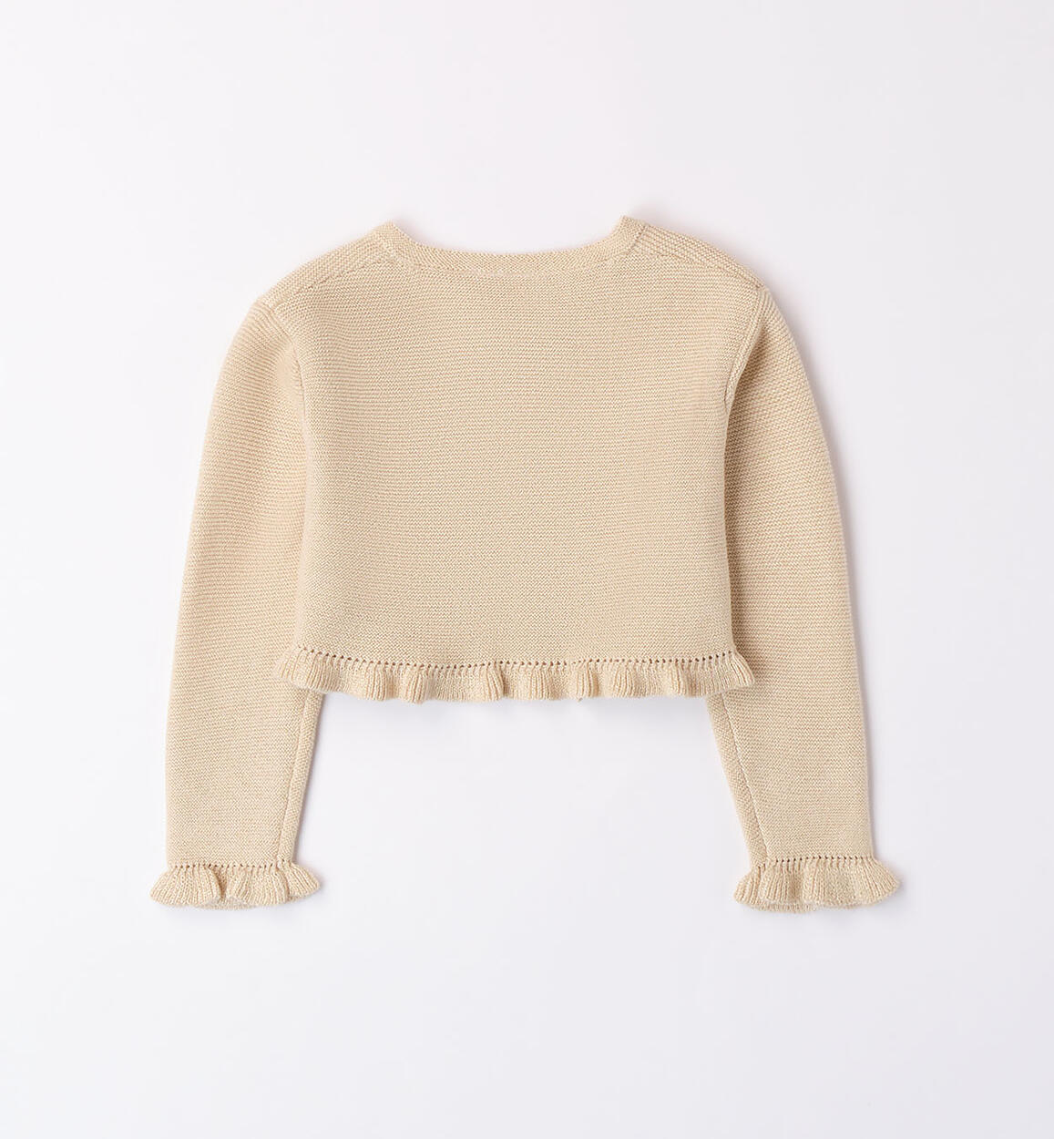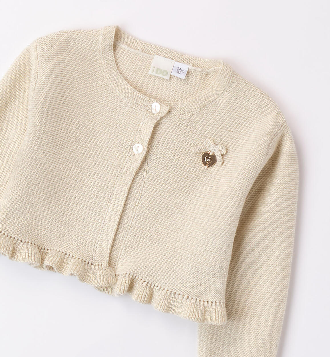 iDO Cardigan for girls in tricot with lurex. The model has front button opening. The cardigan features cute ruffles on the bottom of the sleeves and the bottom of the shirt and a sweet bow with a heart badge. Perfect for completing casual and elegant outfits. Discover the entire selection of iDOMini baby girl cardigans!