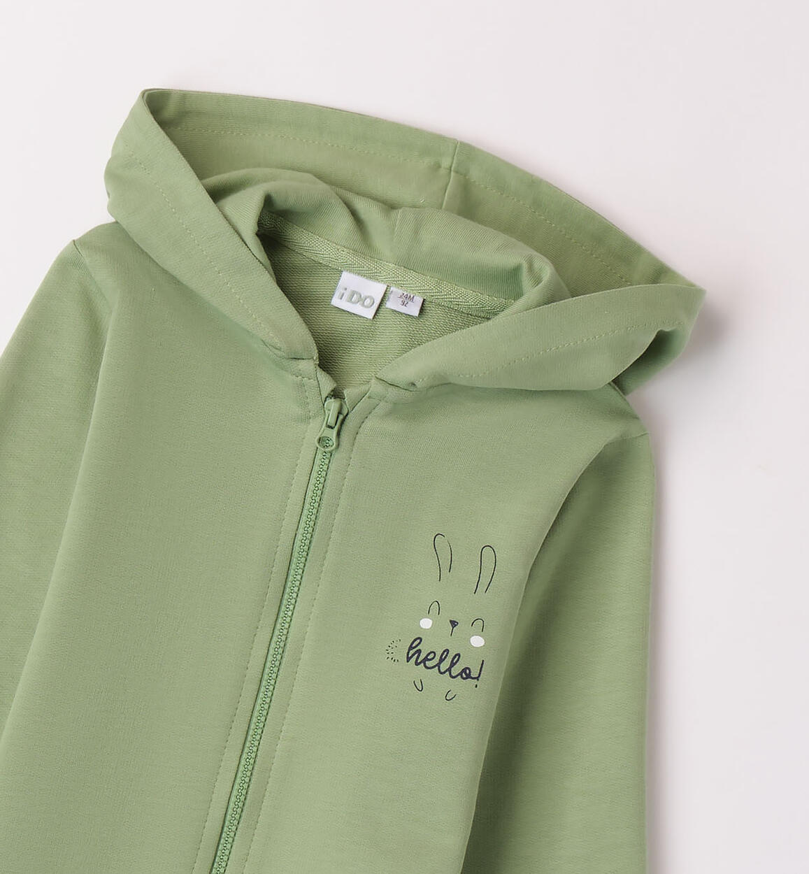 iDO boys' sweatshirt in lightweight 100% cotton jersey fleece. The model has a front opening with zip, and a comfortable and practical hood with ears. The sweatshirt is made in a solid colour pattern with a bunny print. Discover the entire selection of iDOMini boys' sweatshirts!