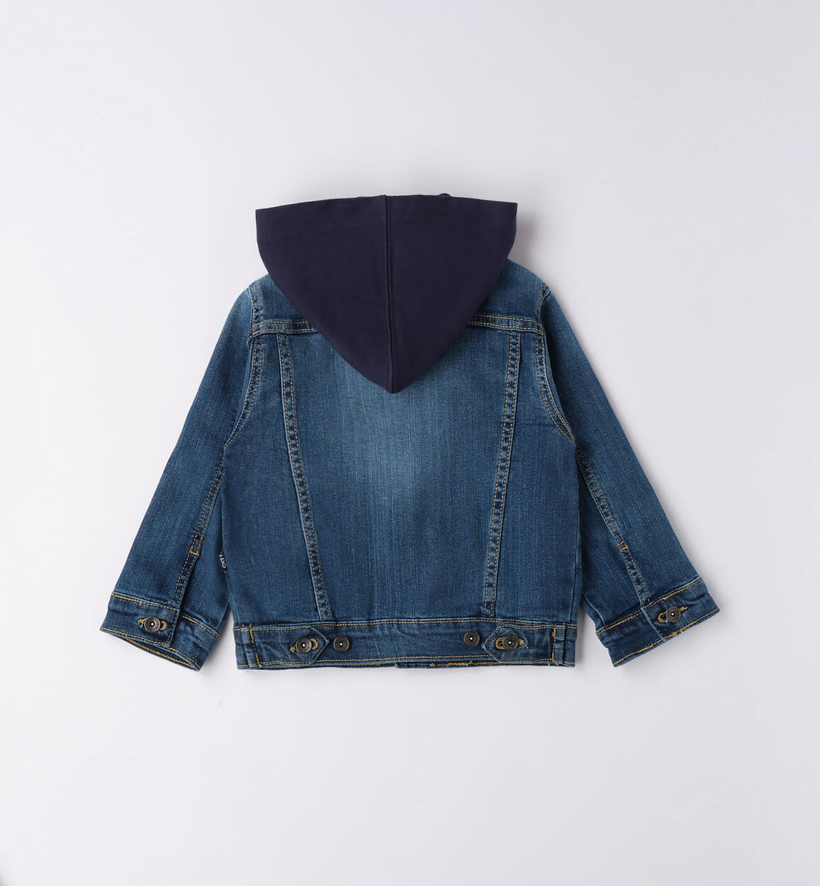 Boy's denim jacket with detachable hood in cotton jersey fleece. Button opening