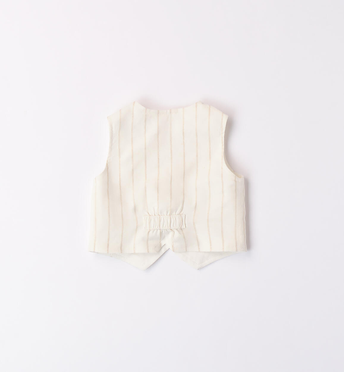 Minibanda baby vest 1-24 months in linen and stretch viscose. This model features a front button opening and mock welt pockets at the side. The waistcoat is made in a striped pattern. Discover the entire selection of Minibanda Waistcoats for boys!