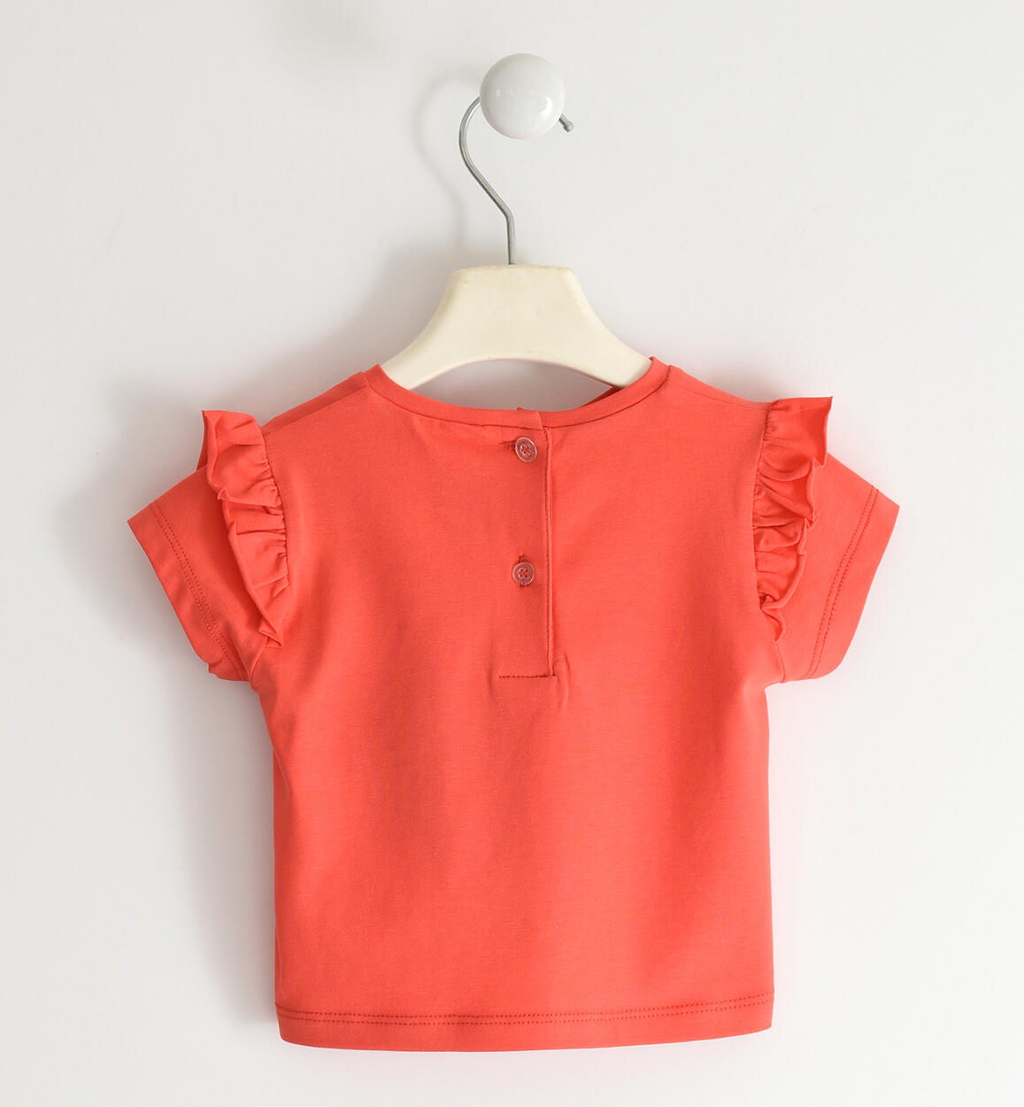 Sarabanda girl's T-shirt in stretch cotton jersey with ruffles on the shoulder and small print. Button fastening at the back up to size 3 years