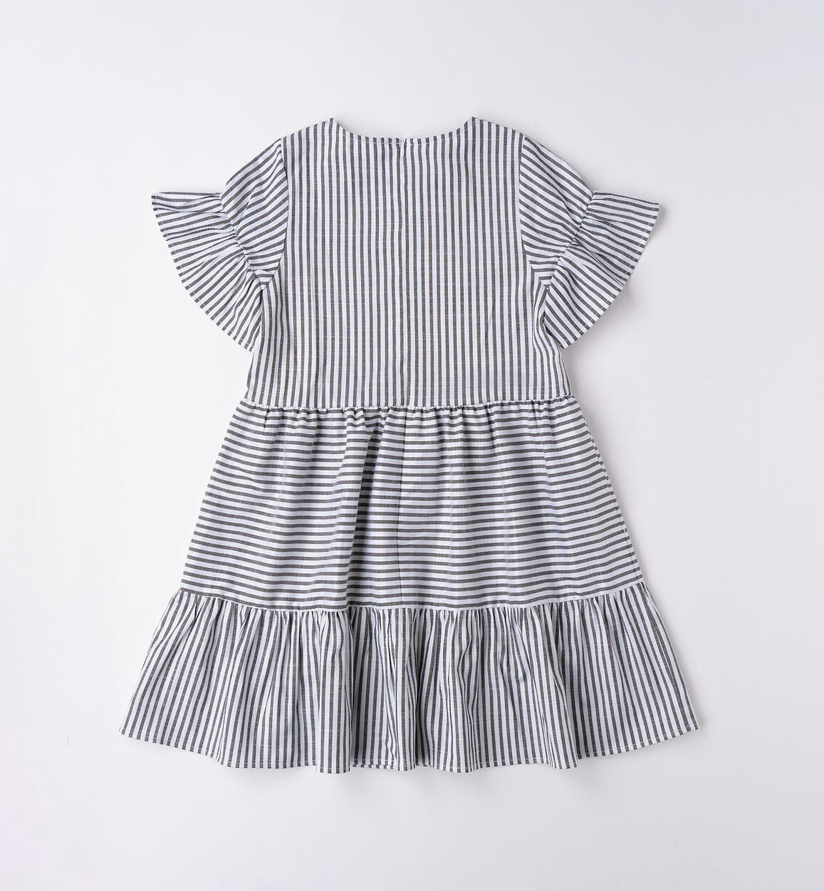 Abito a balze per ragazza iDO a balze con ruches sul fondo manica e stampa a righe all over. Apertura con zip e lunghezza al ginocchio