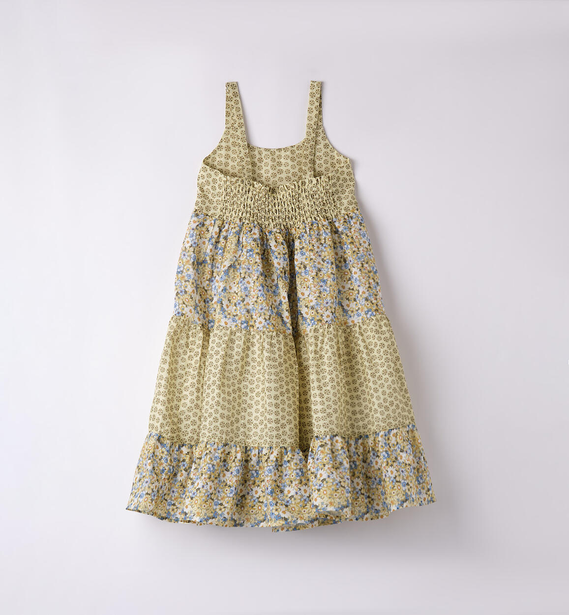 Abito ragazza smanicato iDO in 100% cotone fantasia a fiori. Il vestito è fresco e comodo. Fodera in cotone e lunghezza al ginocchio