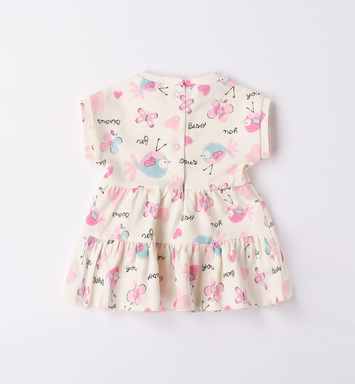 Abito iDO per neonata realizzato in felpa stretch di cotone con fantasia all over, fiocco sul punto vita e gonna a balze. Apertura dietro con bottoni snap. Lunghezza sopra al ginocchio