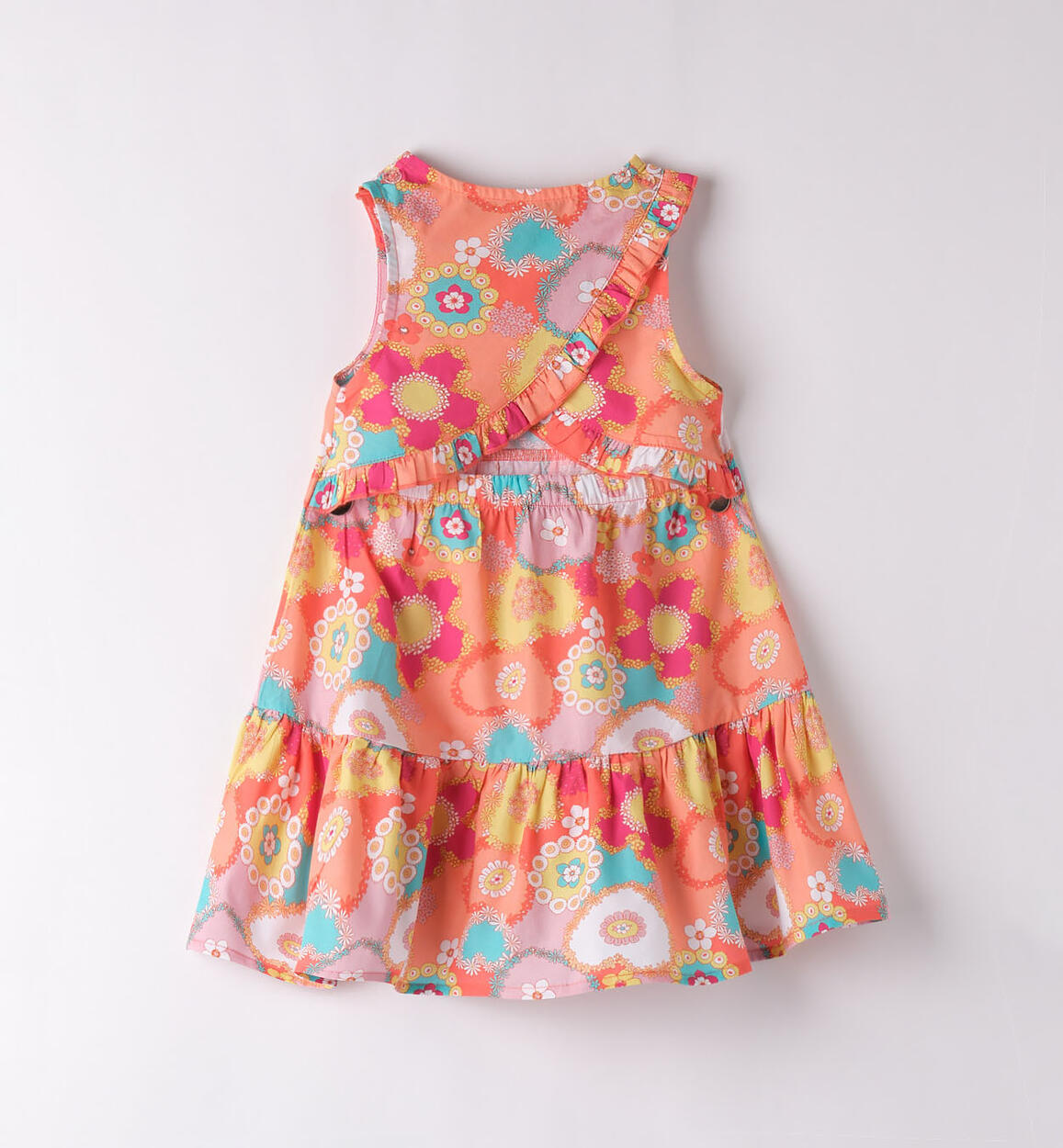 Fresco abito Sarabanda per bambina in popeline 100% cotone, dalla colorata fantasia floreale. Intreccio dietro e apertura con bottoni. Lunghezza sopra al ginocchio