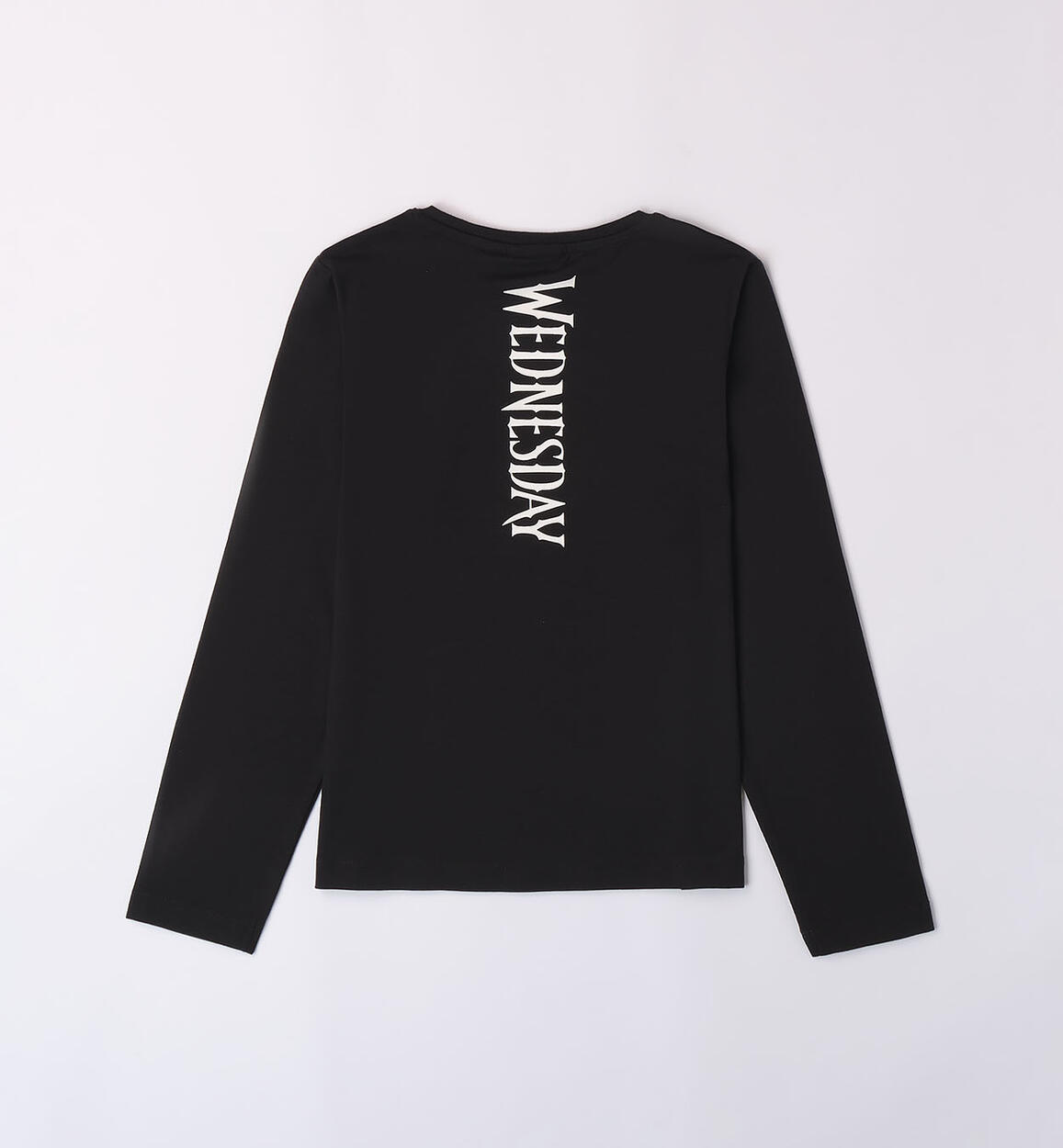 Wednesday Addams t-shirt a manica lunga realizzata in jersey di cotone stretch con grande stampa fotografica davanti arricchita da piccole borchie. Stampa lettering Wednesday sulla schiena