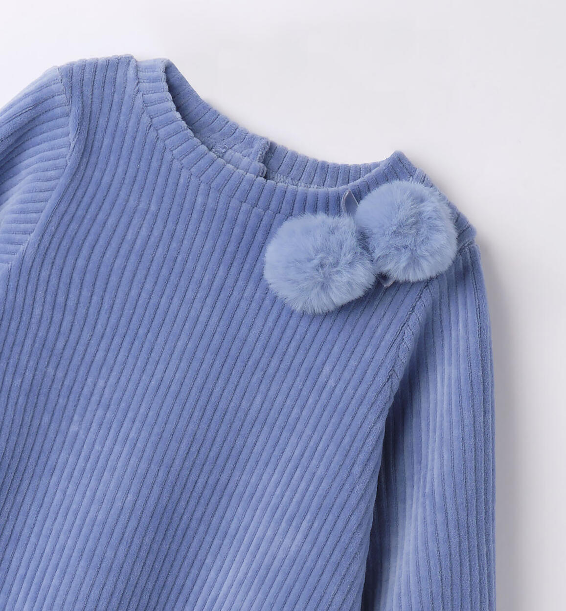 Abito per bambina iDO realizzato in ciniglia stretch a costine, effetto velluto. Modello a manica lunga con applicazione pompon. Lunghezza sopra al ginocchio e apertura dietro con bottoni