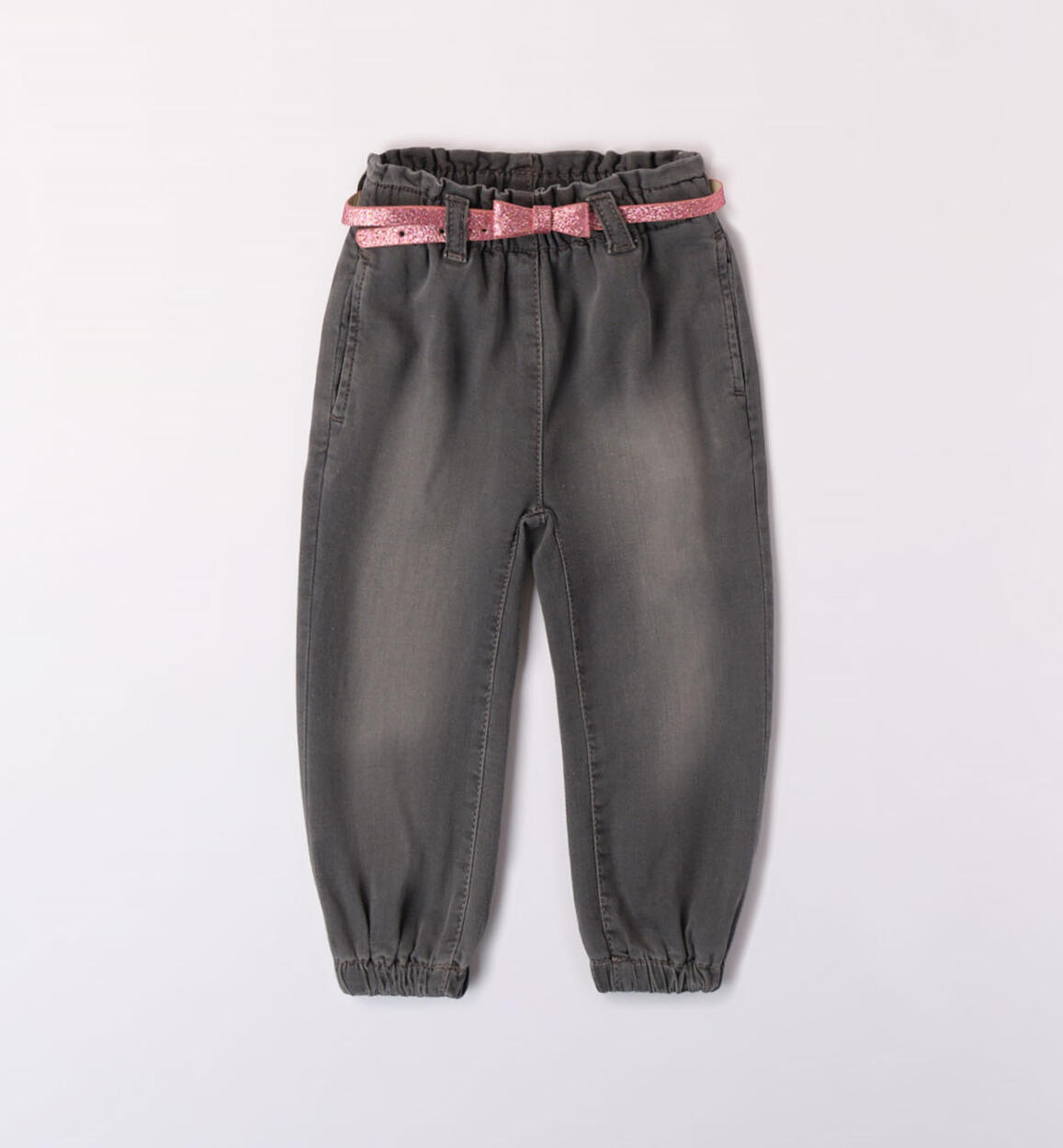 Pantalone per bambina iDO realizzato in denim maglia con vita e fondo gamba elasticizzati. Cintura in abbinamento