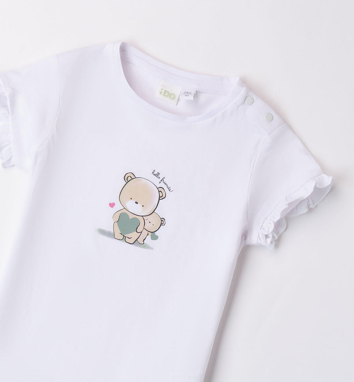 T-shirt iDO per bimba realizzata in jersey 100% cotone. Il modello presenta apertura sulla spalla con bottoni a pressione per agevolare il cambio e la vestizione. La T-shirt è realizzata in fantasia tinta unita con maniche arricciate e stampa orsetti. Scopri tutta la selezione di Maglie e T-shirt bimba firmata iDOMini!