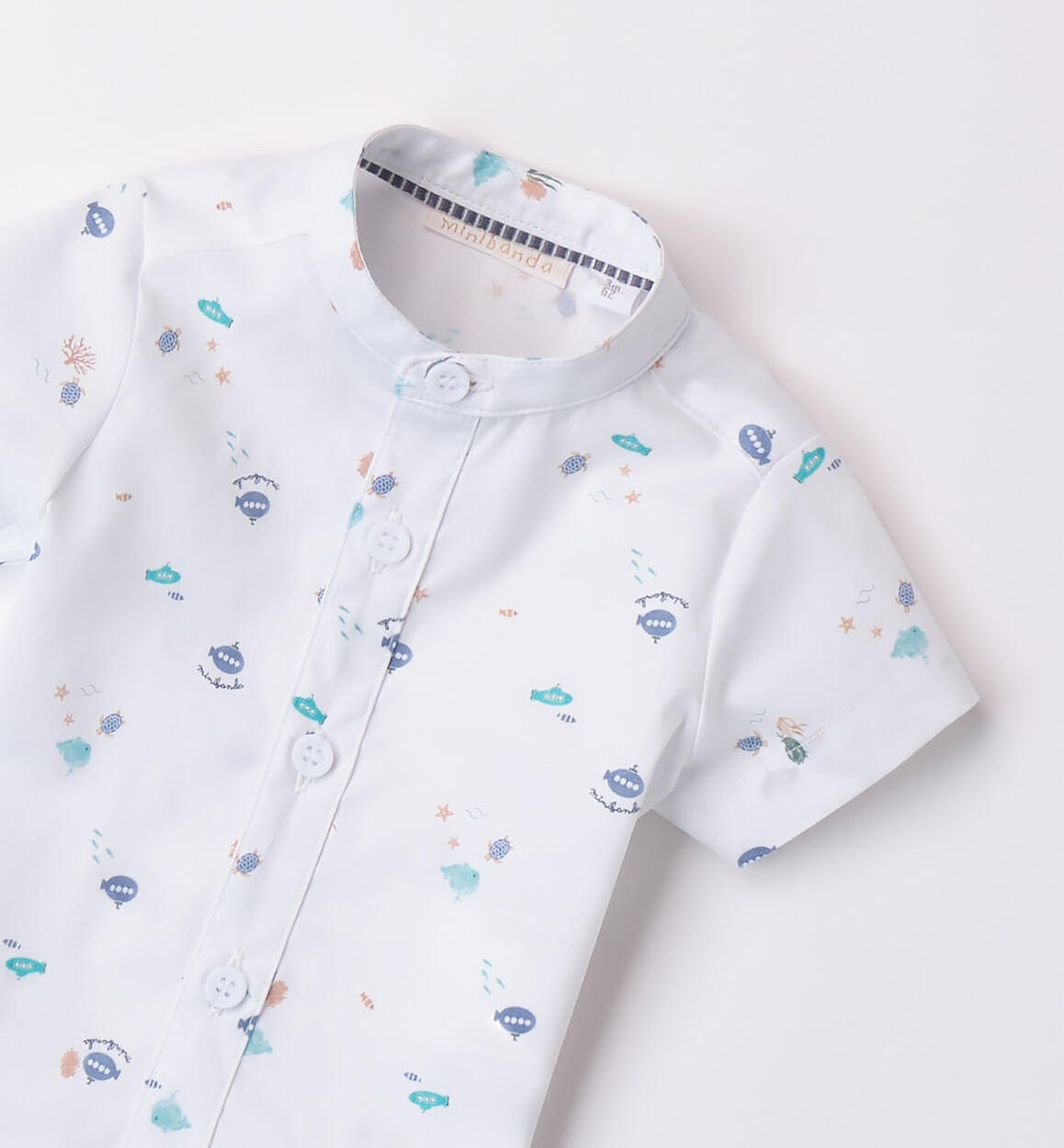 Camicia manica corta per bambino Minibanda 1-24 mesi realizzata in popeline stretch di cotone. Il modello presenta apertura frontale con bottoni e collo alla coreana. Fantasia all over. Scopri tutta la selezione di Camicie bimbo Minibanda!