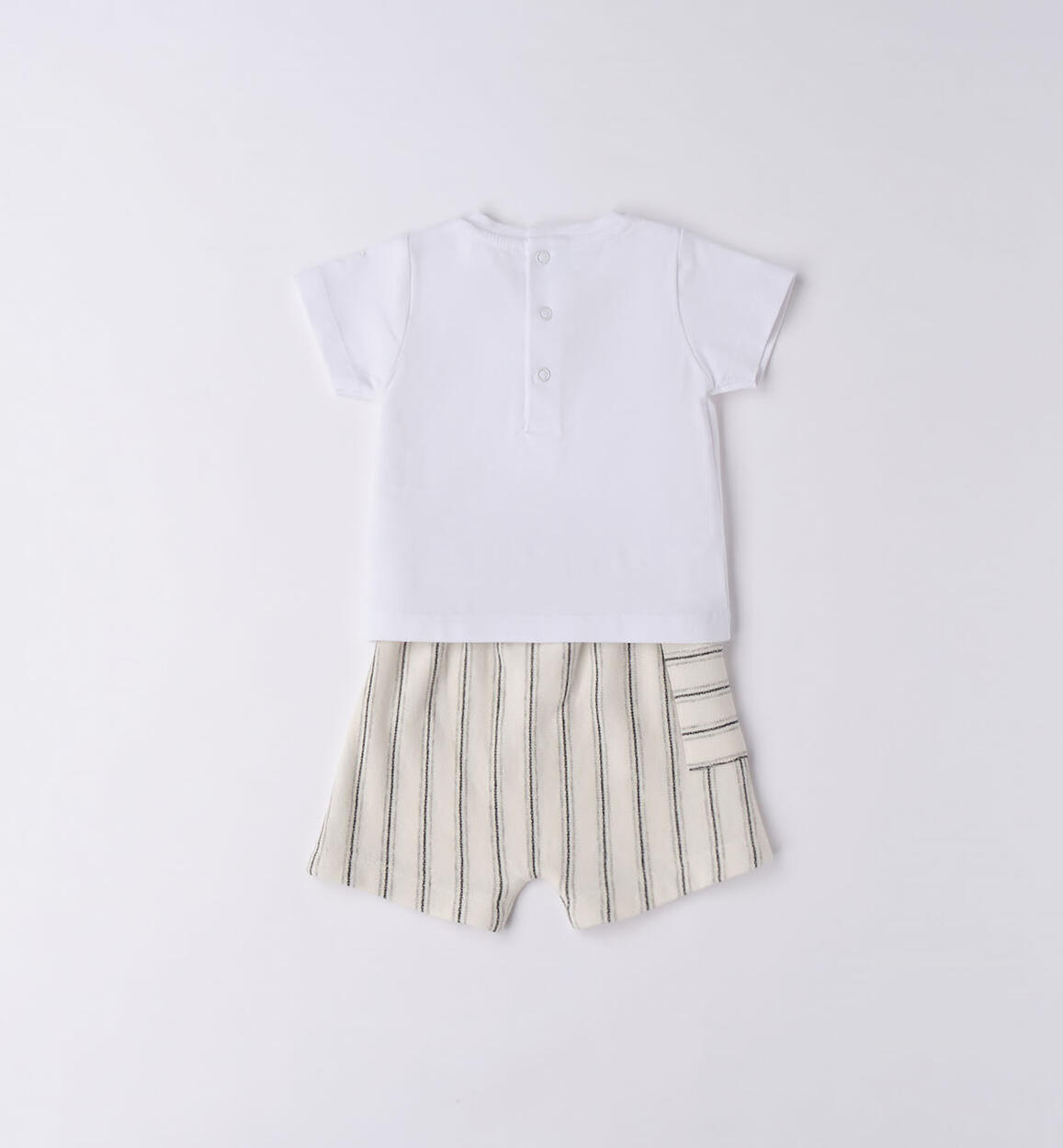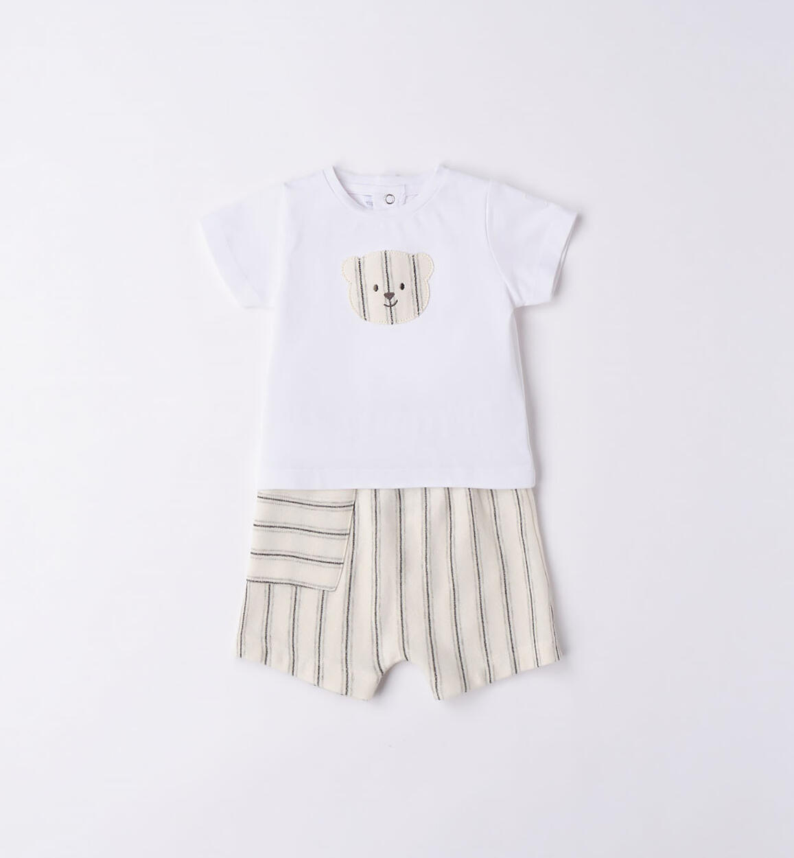 Completo per bimbo Minibanda composto da t-shirt e pantaloncino. La maglietta è in jersey stretch di cotone con dolce applicazione orsetto in abbinamento alla fantasia del pantaloncino corto realizzato in felpa 100% cotone dalla fantasia rigata con tasca laterale