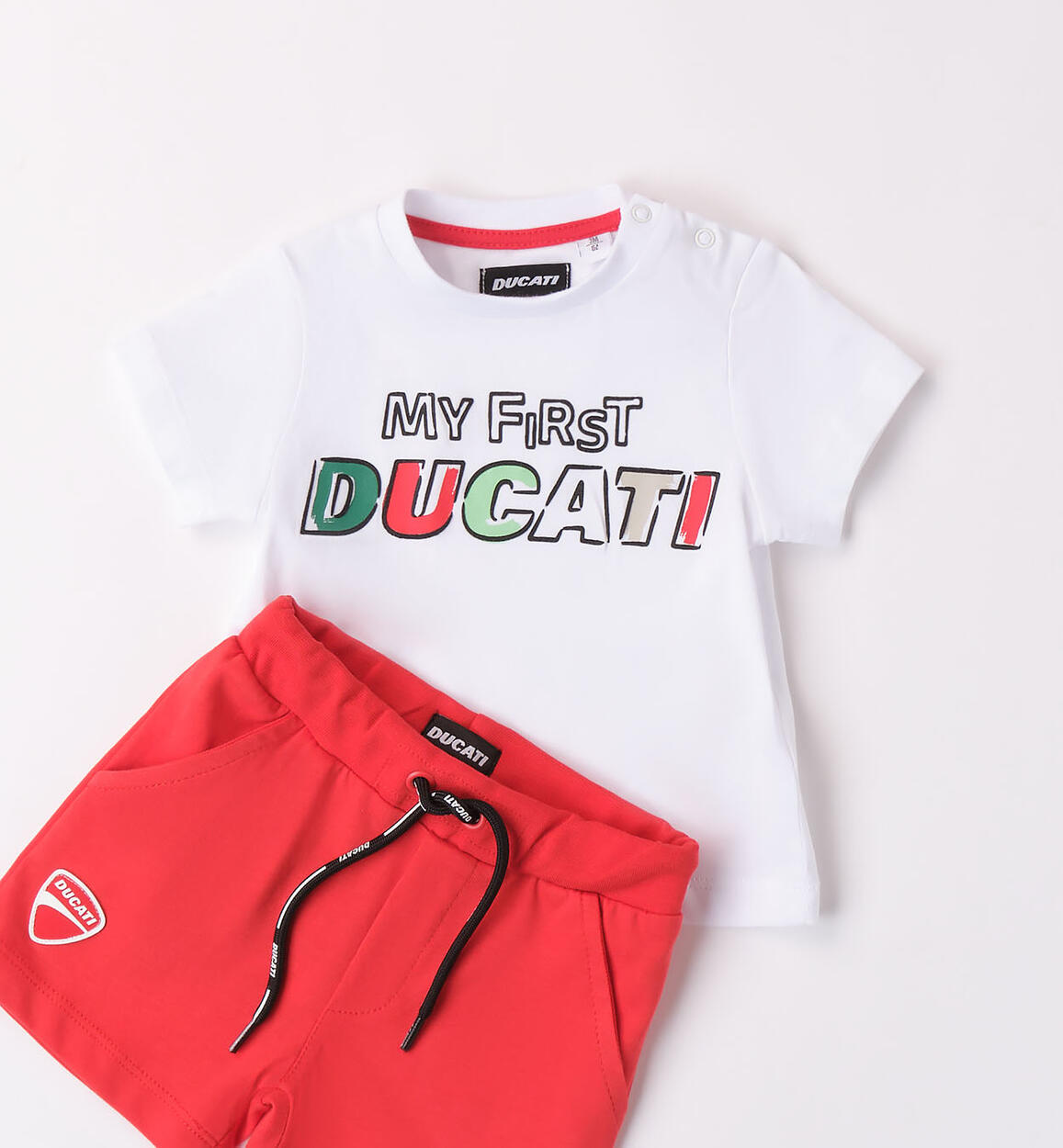 Completino Ducati estivo realizzato in jersey 100% cotone. T-shirt con stampa a rilievo e apertura sulla spalla con bottoni a pressione. Pantalone corto con elastico in vita e coulisse. Badge in applicazione sul fondo
