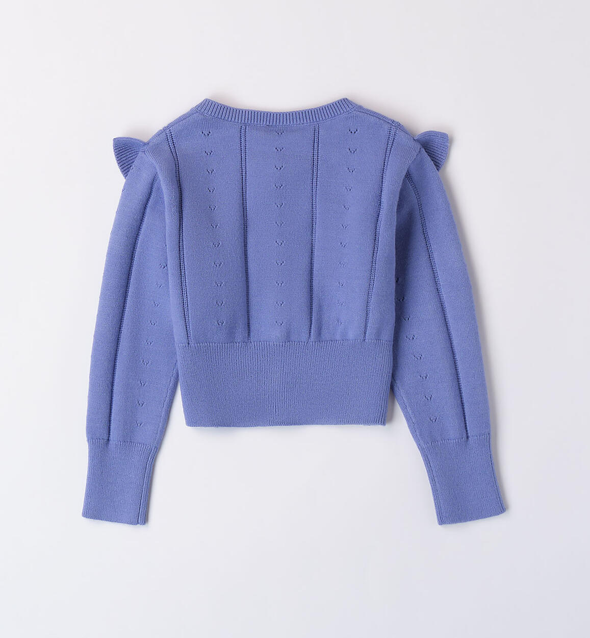 Cardigan corto bambina Sarabanda realizzato in tricot di viscosa con applicazioni strass sul fronte. Chiusura con bottoni gioiello. Capo perfetto per un look primaverile