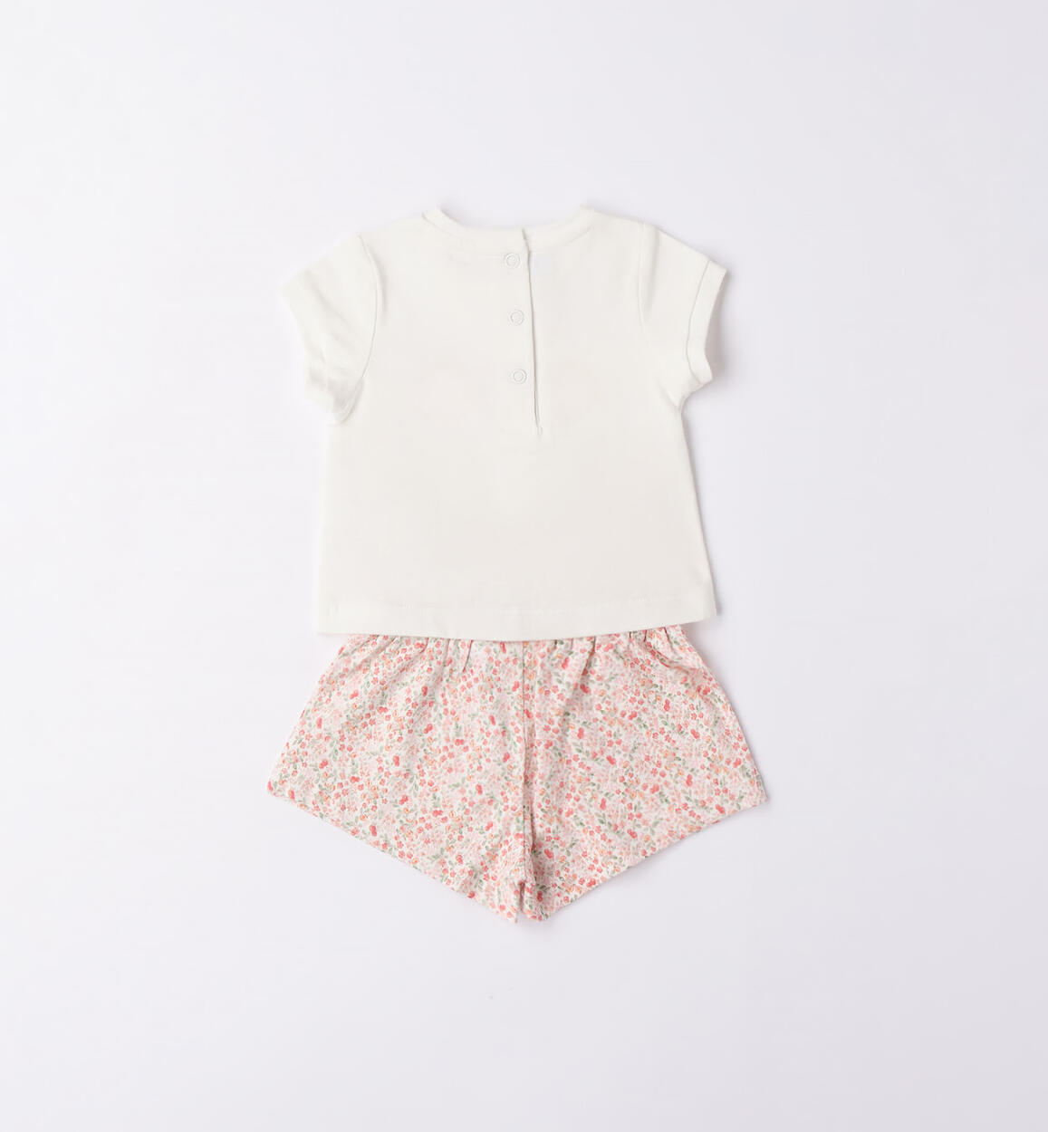 Dolce completo per bimba Minibanda in jersey 100% cotone. La t-shirt è impreziosita da ricamo frutta e applicazioni ricamo. Apertura dietro con bottoni snap. Shorts fantasia floreale con vita arricciata ed elastico