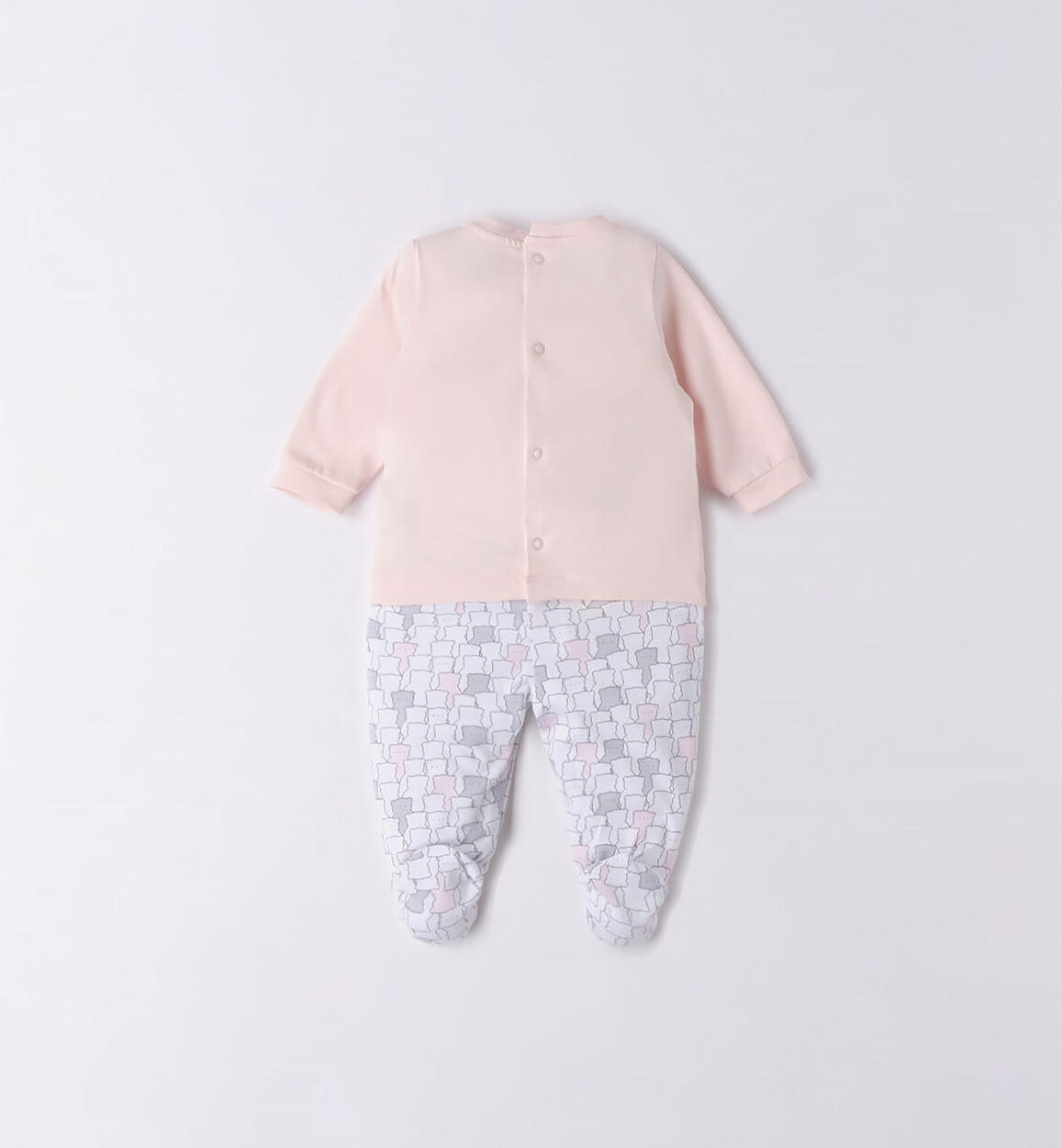 Tutina neonati due pezzi con piedini realizzata in jersey 100% cotone organico. La maglietta è a manica lunga con apertura dietro tramite bottoni snap e arricchita davanti da applicazioni e ricamo di orsetti. La ghettina ha l'elastico in vita e stampa all over di orsetti Minibanda