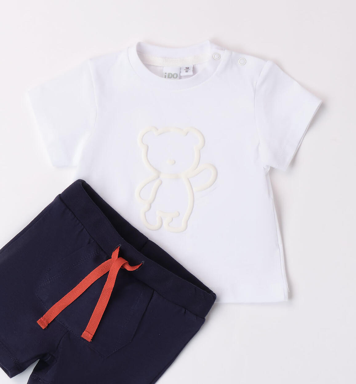 Completo iDO per bimbo realizzato in jersey 100% cotone. La t-shirt presenta apertura sulla spalla con bottoni a pressione per agevolare il cambio e la vestizione ed è realizzata in fantasia tinta unita con orsetto a rilievo. Il Pantalone presenta elastico in vita, coulisse a contrasto e tasca con marsupio. Scopri tutta la selezione di Completi bimbo iDOMini!