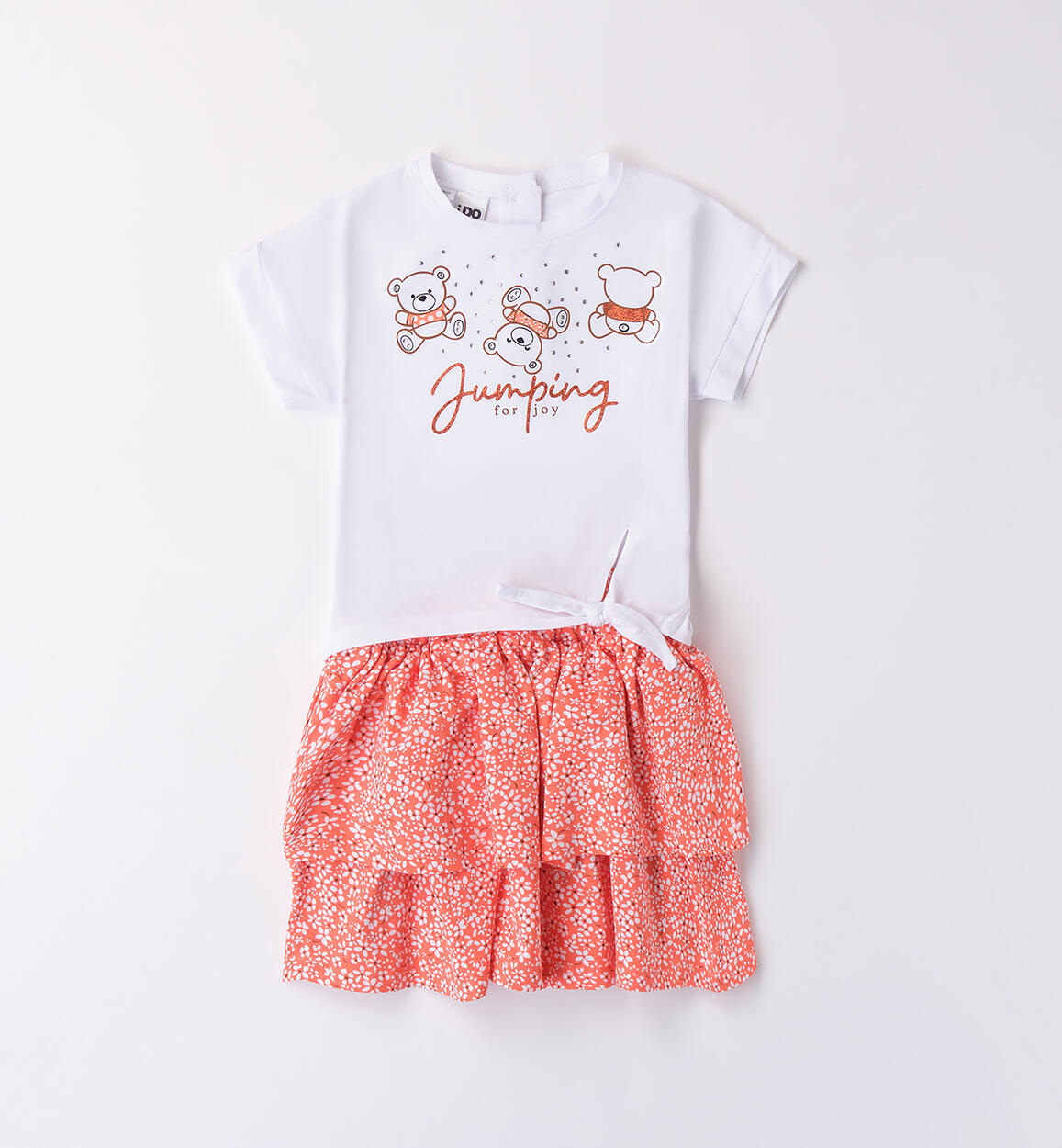 Grazioso completo iDO per bambina composto da t-shirt e gonna realizzato in jersey stretch di cotone. La maglietta ha stampa orsacchiotti con applicazione di strass e dettagli lurex. Nodo davanti. La gonna ha fantasia a fiorellini. Lunghezza sopra al ginocchio. Scopri tutta la selezione di Completi bambina iDO sul sito!