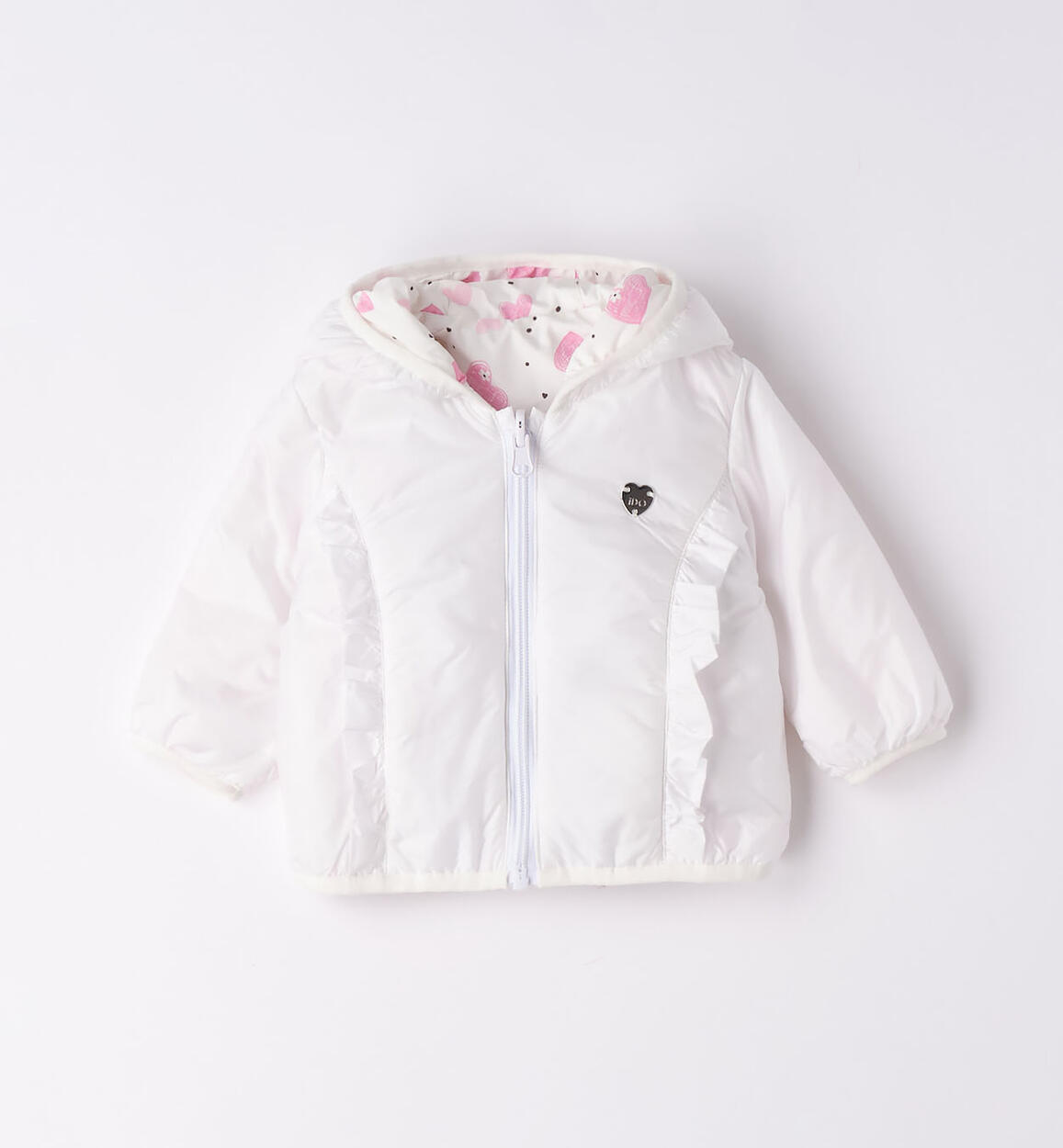 Giubbotto reversibile iDO per neonata realizzato in nylon con leggera imbottitura in ovatta. Modello con cappuccio e apertura con zip. Un lato è tinta unita con ruches e placchetta a forma di cuore, l'altro lato ha fantasia all over di cuori ed è arricchito da tasche