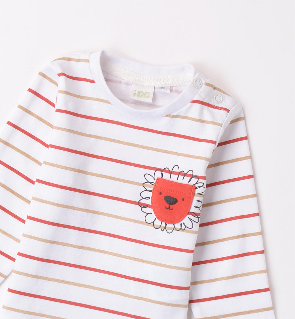 Maglietta girocollo iDO per bimbo in jersey 100% cotone. Il modello presenta apertura sulla spalla con bottoni a pressione per agevolare il cambio e la vestizione. La maglietta è realizzata in fantasia a righe con taschino e stampa di leone. Scopri tutta la selezione di Maglie e T-shirt bimbo firmata iDOMini!