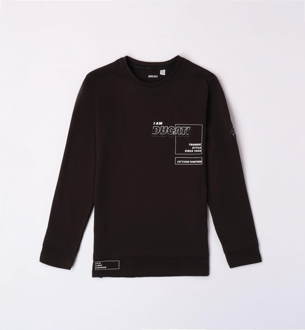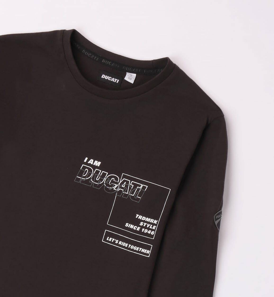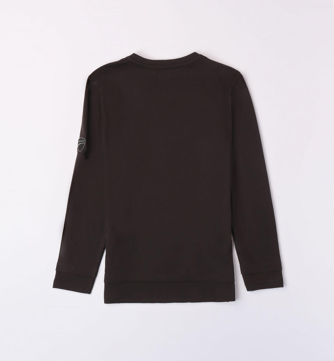 Maglietta Ducati per ragazzo realizzata in jersey 100% cotone. Modello effetto doppio capo con inserti sul fondo e sul fondo manica, La maglietta è arricchita da stampa a rilievo e badge sulla manica. Vestibilità over