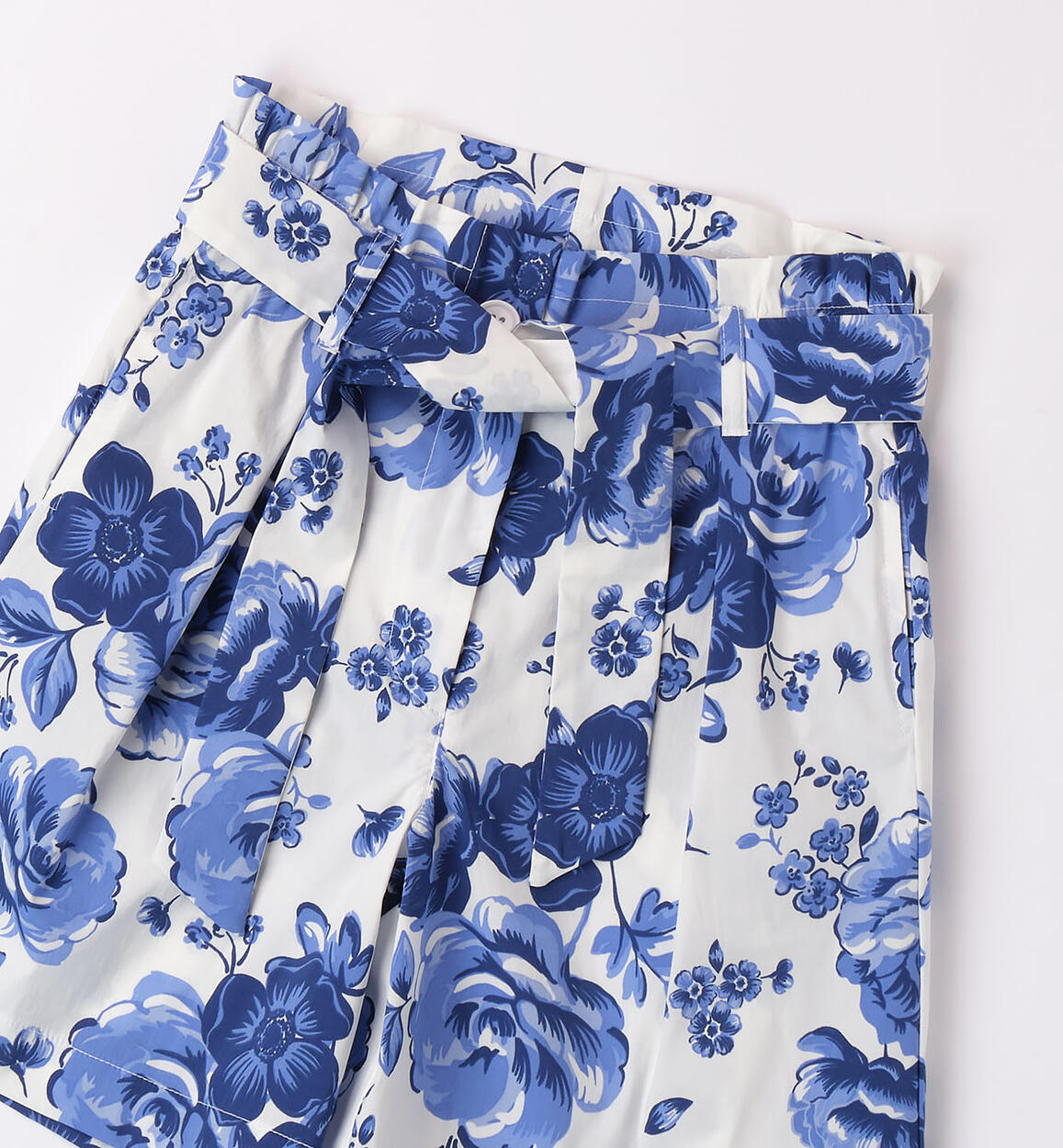 Pantalone corto per ragazza iDO realizzato in popeline stretch di cotone con fusciacca in vita e stampa all over di fiori.