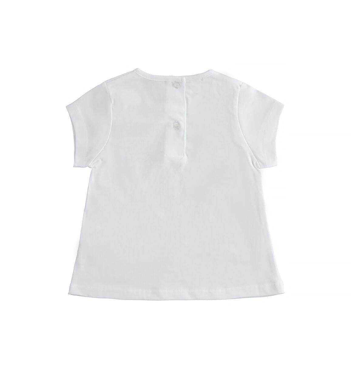 T-shirt bambina iDO realizzata in jersey 100% cotone. La maglietta è arricchita da stampa farfalla con glitter e strass. Apertura dietro con bottoni