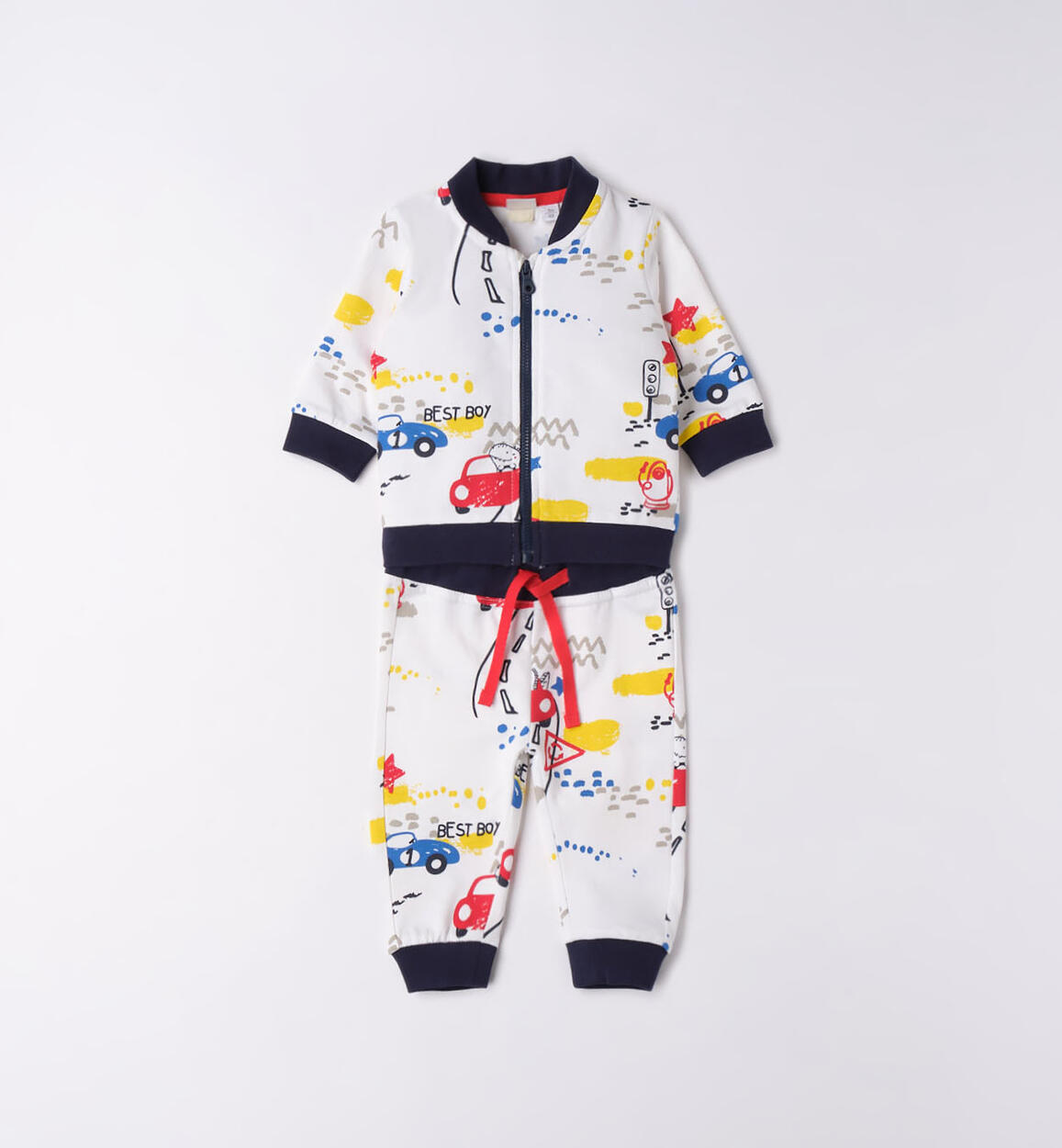 Tuta due pezzi iDO realizzata in felpa 100% cotone. Il giacchetto ha l'apertura con zip e il pantalone ha l'elastico in vita con coulisse e polsini sul fondo gamba. Fantasia all over di colorate automobili