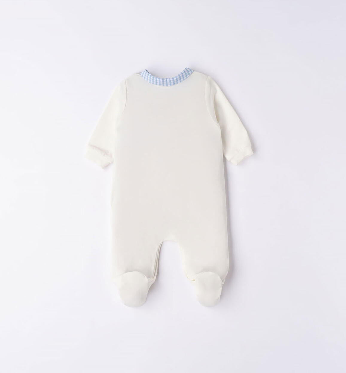 Tutina intera Minibanda neonato con piedino realizzata in jersey stretch di cotone. Apertura laterale e nell'interno cosce con bottoni snap. Colletto in seersucker e applicazione ricamo di animaletti